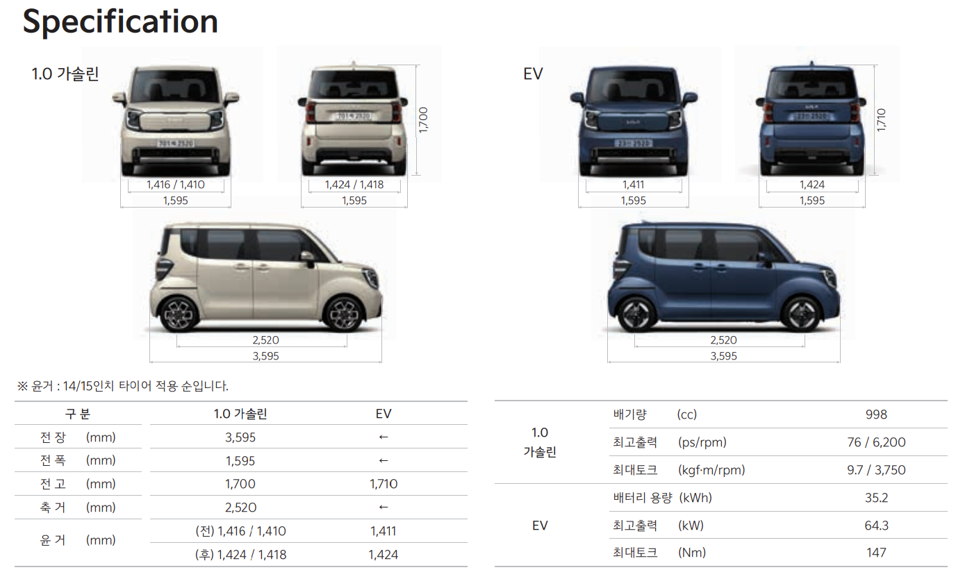 - 차량 크기: 전장 3,395mm, 전폭 1,595mm, 전고 1,640mm