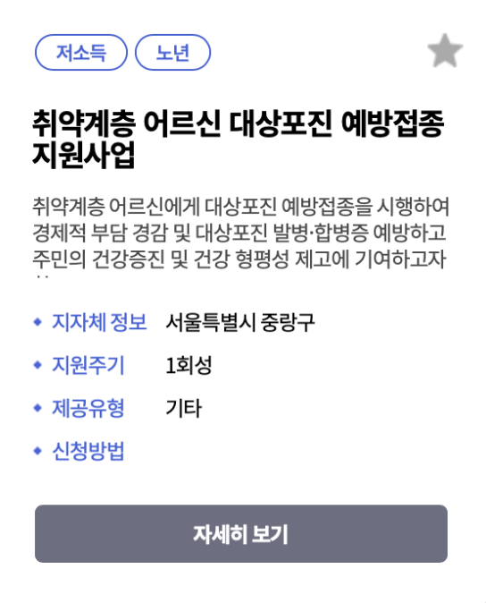 | 서비스 내용 | - 일반주민: 50,000원 지원 - 차상위계층: 80,000원 지원 - 수급자: 보건소 무료 접종 |