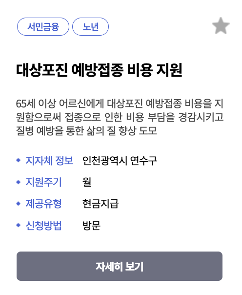 | 선정 기준 | 연수구 관내 65세 이상 어르신 중 대상포진 접종 후 비용 일부 지원 (수급자 보건소 무료 접종) |